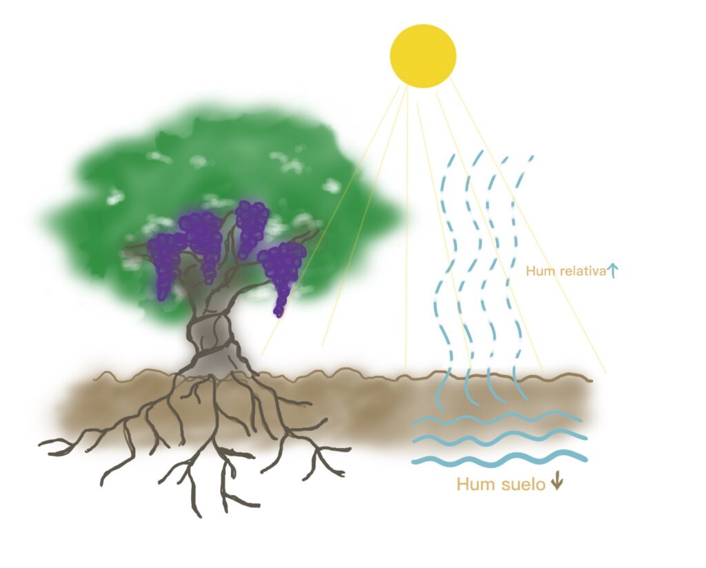 El contenido hídrico del suelo no solo afecta al desarrollo de la vid, sino que tiene una influencia directa sobre el microclima inmediato del viñedo, especialmente en relación con la humedad relativa ambiental. A medida que el suelo superficial comienza a perder humedad, la tasa de evaporación se incrementa. Este vapor de agua liberado contribuye a elevar la humedad relativa en el entorno de la planta, creando condiciones favorables para el desarrollo de enfermedades como el mildiu.